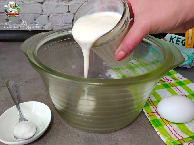 W misce łączę szklankę kefiru, 1 jajko i 1 łyżeczkę soli. Wszystko dokładnie mieszam.