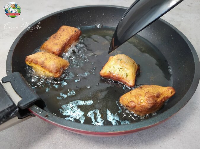 Kwadraty smażę na rozgrzanym oleju. Nie odwracam ciasta, dopóki nie zacznie rosnąć. Gdy tylko poduszki zaczną się napompowywać, przewracam je na drugą stronę.