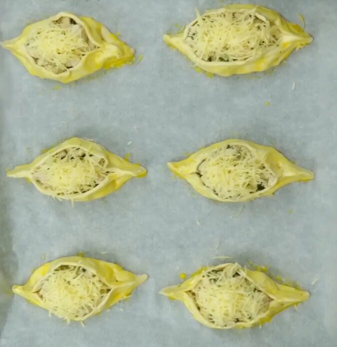 Następnie zamykamy przeciwległe strony, tworząc łodzie. I posyp serem, startym na drobnej tarce.