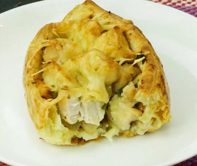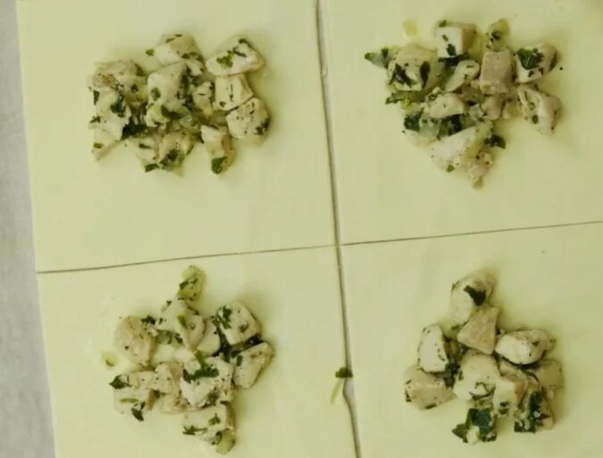 Rozmrażamy ciasto francuskie i wałkujemy go. Pokrój go na kwadraty 10-15 centymetrów każda strona.