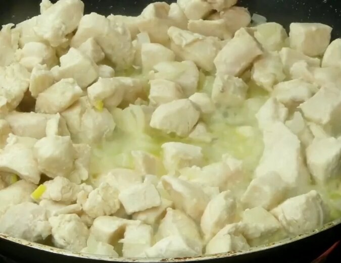 Pokrój pierś z kurczaka na małe kostki i usmaż ich razem z cebulą. Smażyć bez pokrywy, aby nie było nadmiaru płynu.