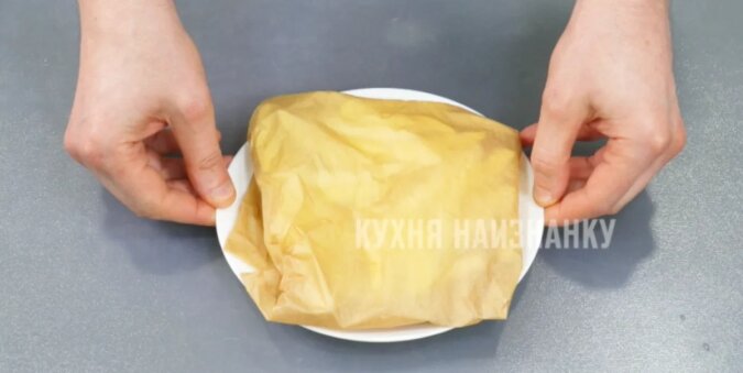 Owiń papier kopertą. Połóż na talerzu i włóż do kuchenki mikrofalowej na 3 minuty. Moc kuchenki mikrofalowej jest 800 W.