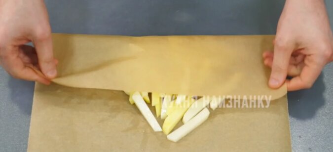 Następnie połóż ziemniaki na kartce papieru pergaminowego, sól i polej trochę oleju. Wymieszamy to.