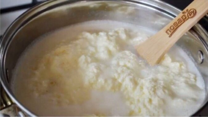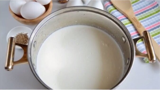 Na początek wlej mleko i kefir do garnka, a zatem postaw na ogień. Trochę odczekaj aż mieszanka mleczna będzie dobrze podgrzana (ale nie doprowadzaj do wrzenia). W międzyczasie do jajek dodaj sól. Zatem jajka należy ubić. Gdy mieszanina mocno się rozgrzeje, dodaj jajka i gotuj na małym ogniu ciągle mieszając, aż serwatka się rozdzieli.
