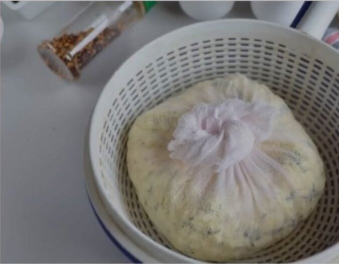 Teraz weź durszlak, wyłóż go gazą złożoną na dwie warstwy, a następnie wyłóż masę serową. Zioła i czosnek posiekaj, połąćz z czerwoną papryką, a później dodaj do masy serowej.