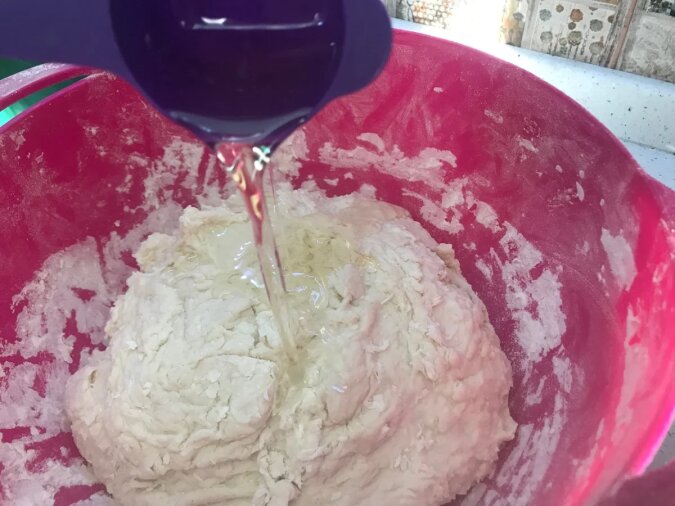 Rozgniataj ciasto do momentu kiedy będzie lekko przylegać do rąk. Dodaj olej roślinny (25 ml) i ponownie dobrze ugnieć.