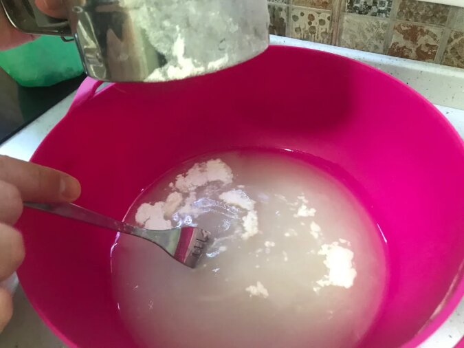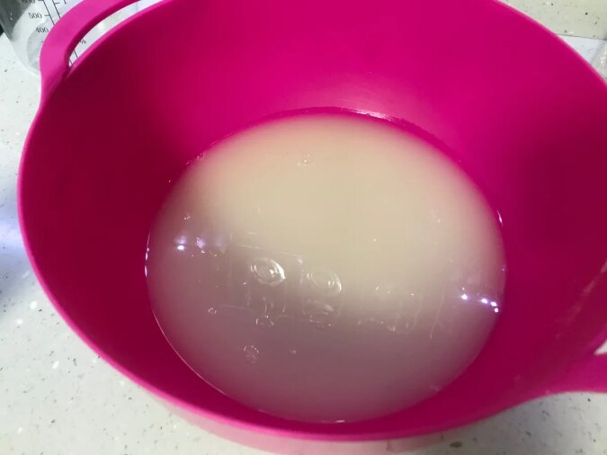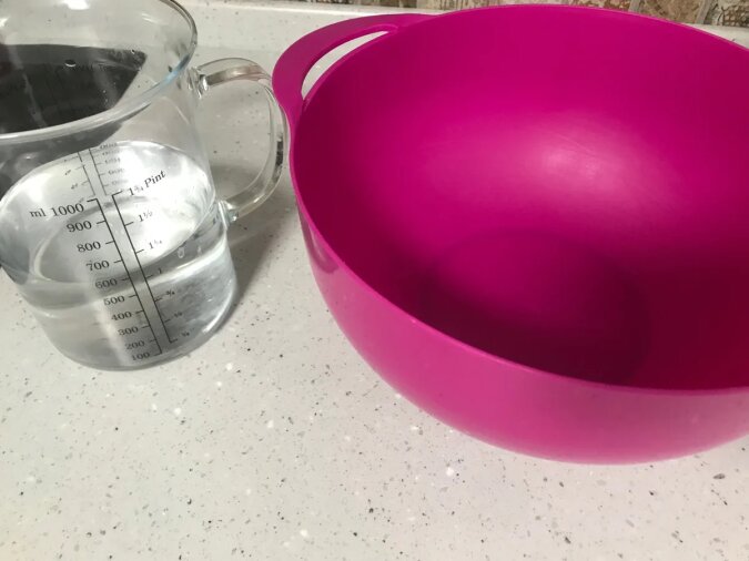 Aby wygodniej było zagnieść ciasto użyj głębokiej miski lub garnka i napełnij 600 ml wody.