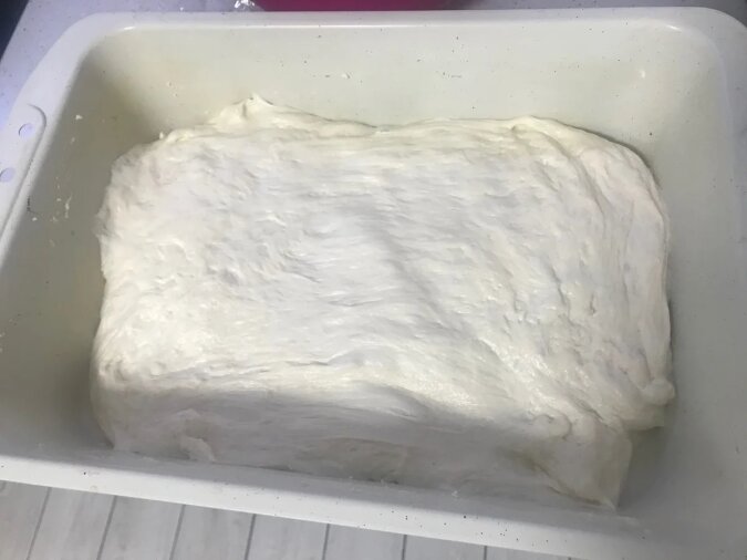 Przekładam ciasto do obszernej formy (aby ciasto zajęło około 1/3 objętości), dodatkowo smaruję masłem, przykrywam i pozostawiam na kolejne 15 minut.
