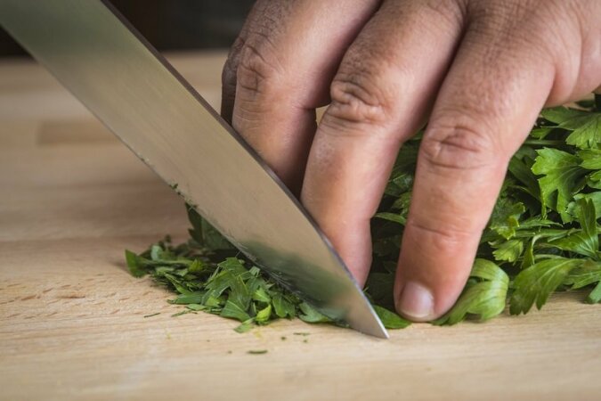 Drobno posiekaj warzywa. Można użyć koperku lub pietruszki.