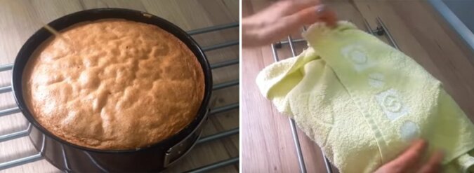 Ciasto biszkoptowe odstawiamy do częściowego wystygnięcia. Następnie odwracamy go „do góry nogami”, a następnie przykrywamy miękkim bawełnianym ręcznikiem. Czekamy aż osągnie temperaturę pokojową. Dzięki temu ciasto będzie miękkie i delikatne, a jego brzegi nie będą chrupiące.