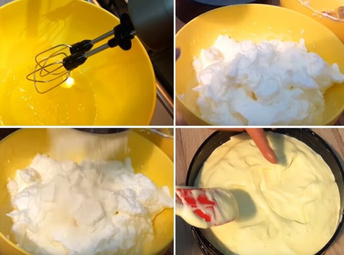 Białka ubijamy za pomocą miksera, dodając szczyptę soli, aby ubita piana była sztywna. Dodajemy połowę cukru (lub cukru pudru), a także sok z cytryny. Kontynuujemy ubijanie jeszcze przez chwilę.