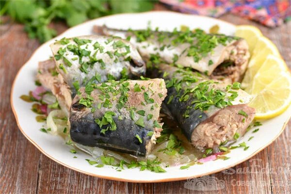 8. Na inny duży talerz wykładamy całą cebulę z rondla, umieszczamy na wierzchu kawałki ryb, podlewamy ją sokiem z cytryny, niewielką ilością oleju (można bez niego), posypujemy czarnym pieprzem, drobno posiekaną natką pietruszki i natychmiast podajemy. Makrela okazuje się bardzo soczysta, ze względu na przyprawy i cebulę pachnącą i smaczną.