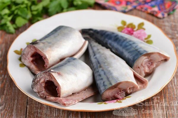 1. Do rondla (objętość 3 litrów) wlej wodę i podgrzej. Na 4 porcje biorę 2 makreli o wadze około 730 gr. Przed tym jej rozmrażamy, myjemy i odcinamy płetwy.