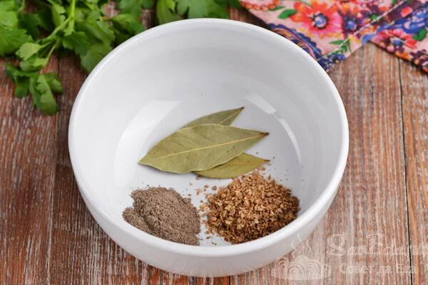 4. Z przypraw biorę czarny pieprz (1 łyżeczka), liść laurowy i kolendrę. Uwielbiam kolendrę, gotuję z nią mięso i ryby. Kupuję go w nasionach i mielę w moździerzu. Zapach z niego jest niesamowity.