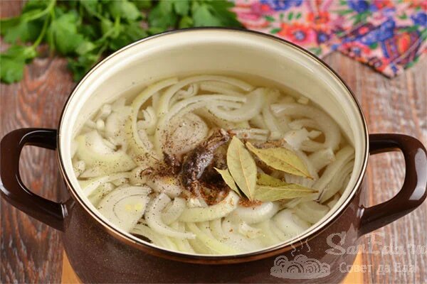 5. Do wrzącej wody dodajemy sól (1 łyżkę), przygotowaną cebulę i przyprawy. W wysokiej temperaturze szybko doprowadzamy do wrzenia.