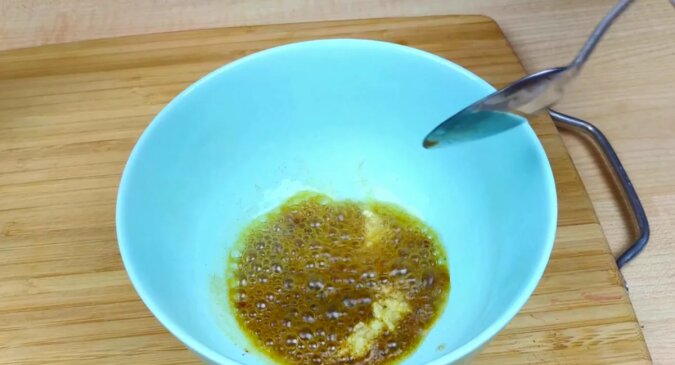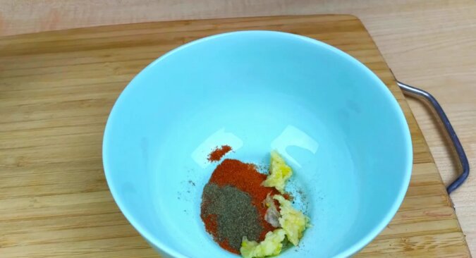 Do osobnego talerza dodaję następujące przyprawy: mieloną kolendrę, słodką paprykę, czarny pieprz (możesz również użyć pieprz czerwony). W tym samym talerzu ścieram trzy ząbki czosnku.