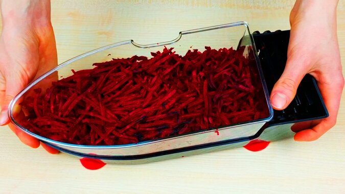 Ścieram buraki na tarce dla koreańskiej marchewki. Jeżeli nie masz takiej tarki, możesz po prostu użyć grubszej - to też będzie dobre.