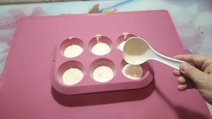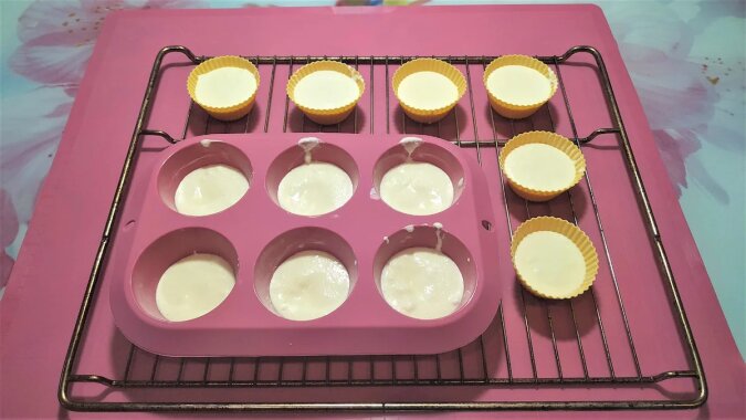Następnie weź formę silikonową, posmaruj masłem, dodaj ciasto, ale nie po brzegi, ponieważ ciasto zostanie lekko podniesione w piekarniku. Rozgrzej piekarnik do 180°C, włóż formy i piec przez 25 minut.