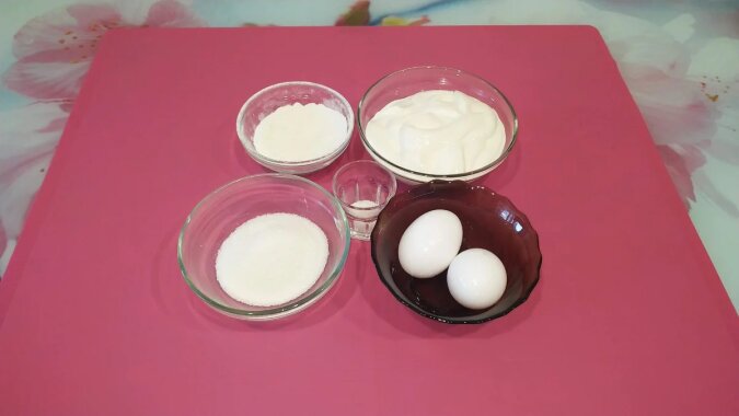 Bierzemy jajka i oddzielamy żółtko od białka. Ubijamy białko mikserem do bujnej białej masy. Swoim mikserem ubijałem około 5 minut. Następnie weź miskę, dodaj śmietanę, dwa żółtka, cukier, cukier waniliowy i dobrze wymieszaj wszystko.