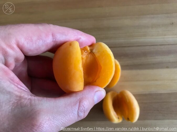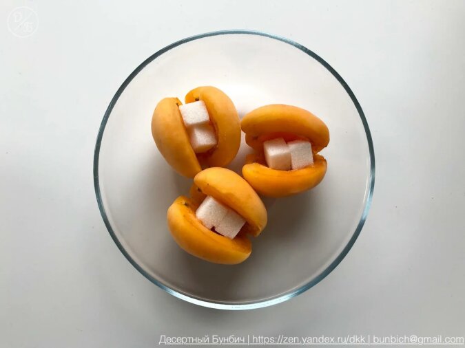 Następnie ściskamy moreli tak, aby cukier wcisnął się w miąższu i przesiąkł sokiem z owocu.