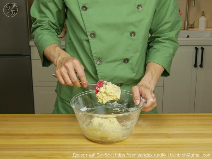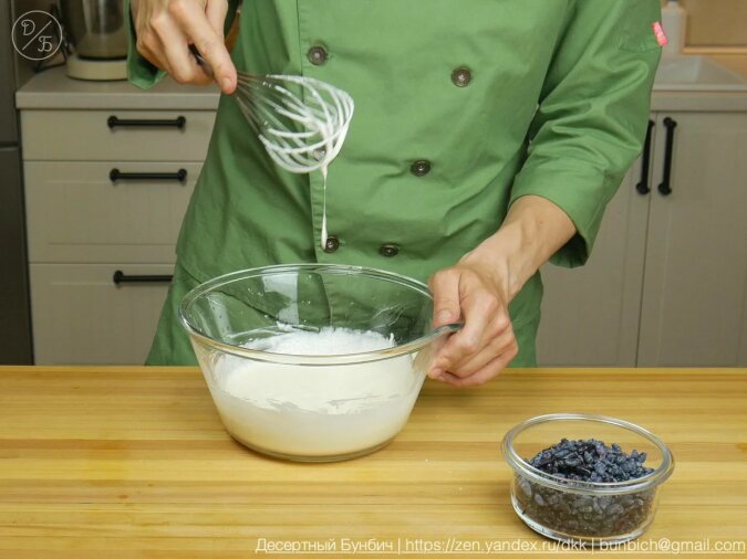 Mąkę przesiewamy z proszkiem do pieczenia, a zatem składniki łączymy za pomocą łopatki.