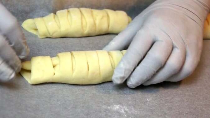 9. Zawiń w rogal, powtórz proces z resztą ciasta i kremem.