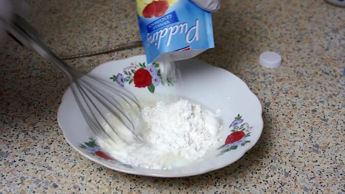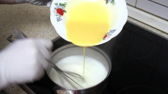 4. Gotujemy krem: wlej mleko do rondla i doprowadź do wrzenia. Dopiero kiedy mleko się nie nagrzeje, odlej 5 łyżek do osobnego pojemnika i rozpuścić w nim półprodukt puddingu, dodaj cukier, dokładnie wymieszaj.