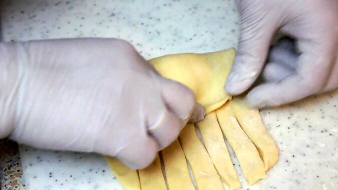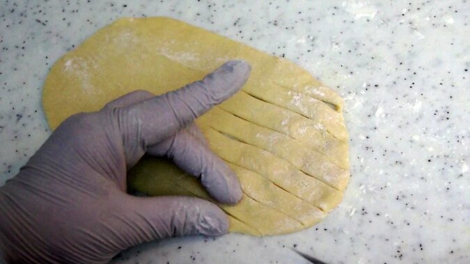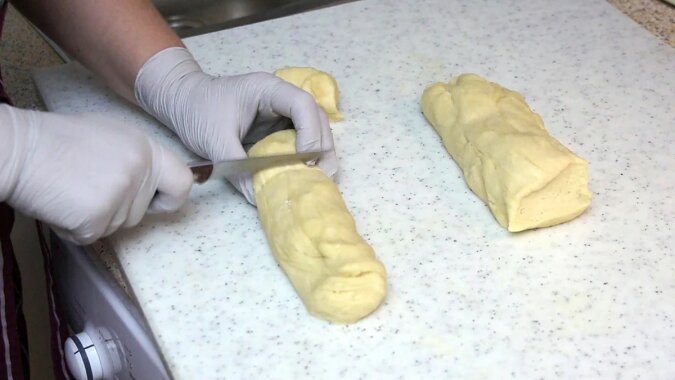 6. Ciasto trzeba podzielić na równe 10 części. Jedną część rozwałkować na posypanej mąką powierzchni w postaci owalu.