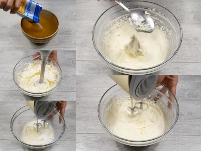 Ubij twaróg mikserem, aż będzie „gładki”. Wymieszaj śmietanę z cukrem pudrem i cukrem waniliowym, ubij mikserem. Jedną łyżkę tej mieszanki dodaje się do twarogu, ubijamy do uzyskania kremowej konsystencji.