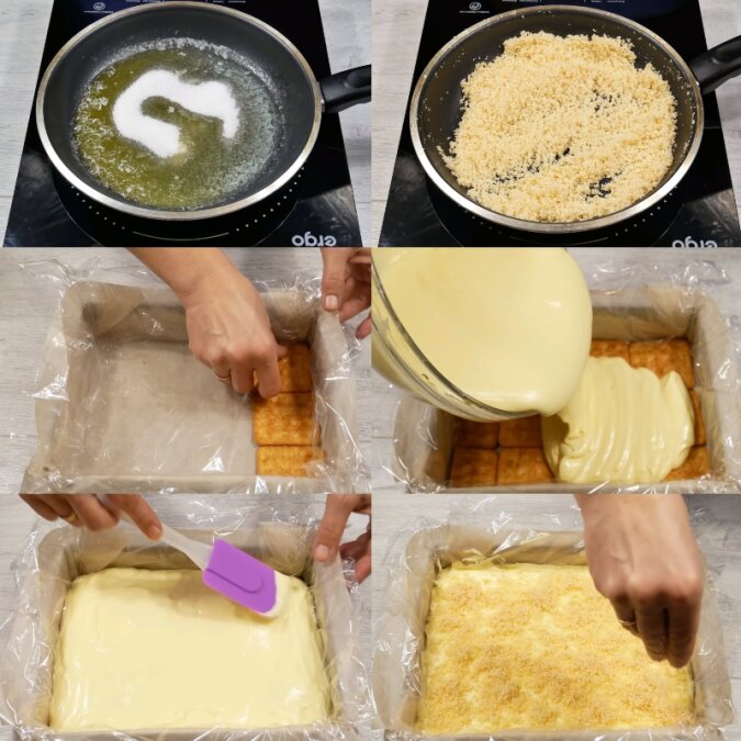 Przykrywamy formę folią spożywczą, kładziemy warstwę ciasteczek na dół, a na górę - masę twarogową.