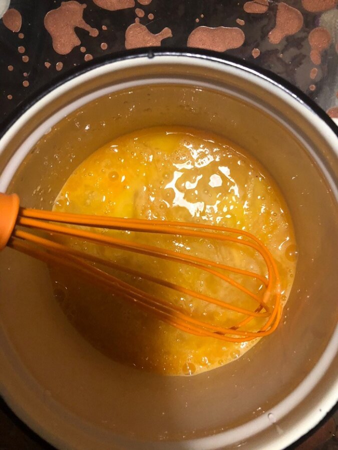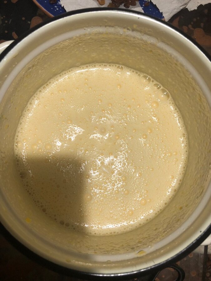 Dodaj do mieszanki jajecznej śmietanę i sodę. Wszystko dokładnie wymieszaj.