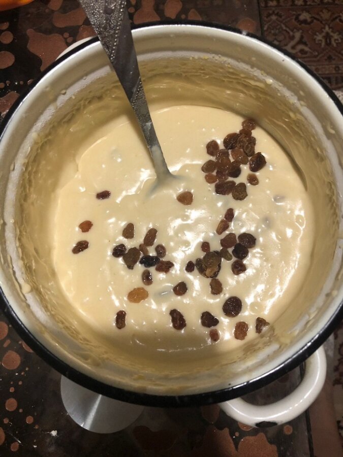 Umyj rodzynki ciepłą wodą, a następnie wysusz na ręczniku papierowym. Rodzynki posyp resztą mąki, a następnie dodaj do ciasta. Wszystko dobrze wymieszaj.