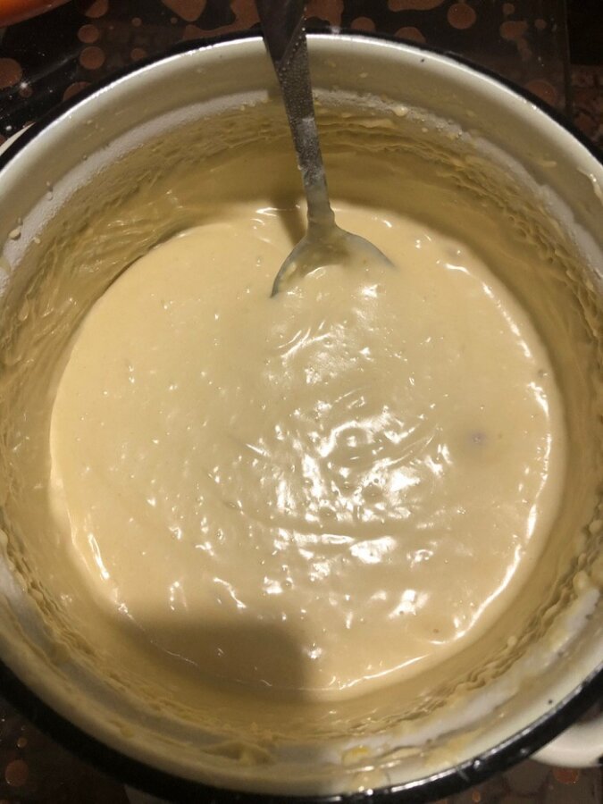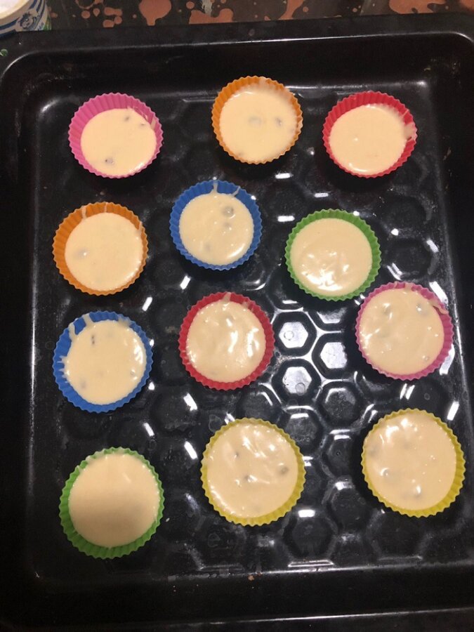 Teraz wlej ciasto do foremki na około centymetra wysokości, nie więcej, ponieważ babeczki wyrosną podczas pieczenia.