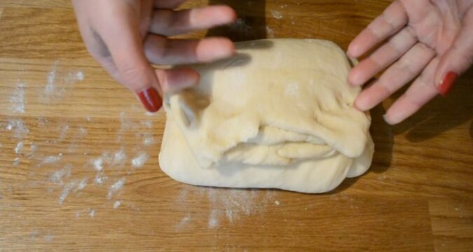 Za godzinę ciasto urośnie, teraz lekko go rozwałkowujemy, składamy w kopertę i odstawiamy na 15 minut.
