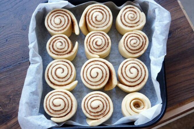 Następnie zwiń w rolkę, wyrównaj i ukrój na kawałki. Układamy bułeczki w wysmarowanej i wyłożonej papierem do pieczenia formie, nie wkładamy od razu do piekarnika, odczekaj 15-20 minut.