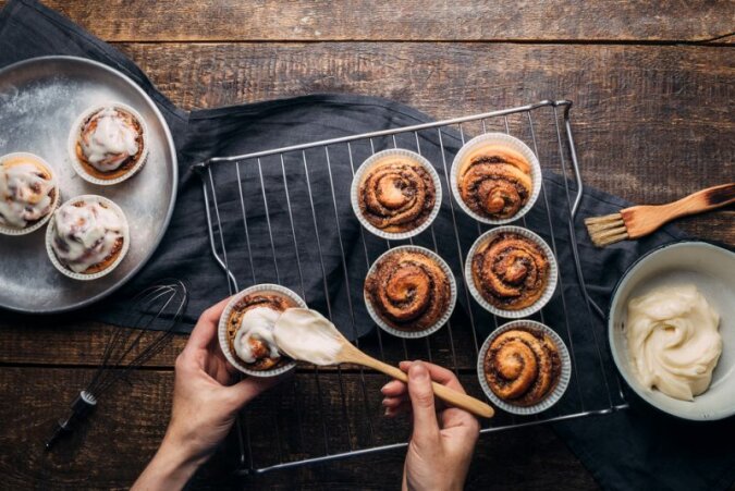Dla kremu mascarpone należy wymieszać z cukrem pudrem. Nasmaruj gorące bułki taką polewą i pozostaw do nasączenia na 10 minut.