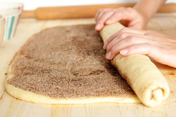 Rozwałkuj ciasto w prostokąt o grubości około 5 mm. Następnie posmaruj ciasto masłem, posyp cukrem zmieszanym z cynamonem.