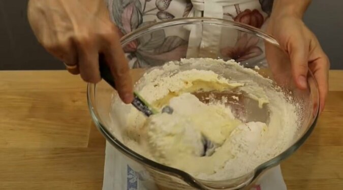 4. W osobnym naczyniu wymieszaj mąkę ze szczyptą soli, sodą i proszkiem do pieczenia. Dodawaj suche składniki do ciasta przez sito. Wymieszaj wszystko łyżką do jednorodności.