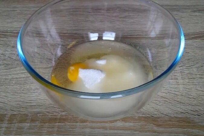 1. W misce należy wymieszać jajko, cukier, olej roślinny oraz mleko. Zatem ubijamy trzepaczką, aż masa będzie jednorodna.