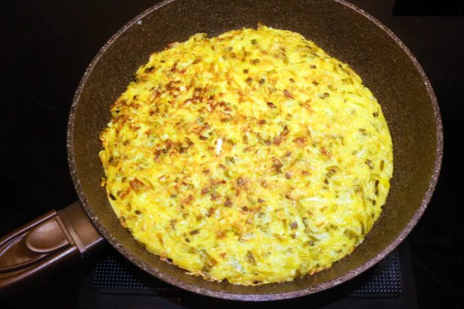 Placek smażę na małym ogniu - około 15-20 minut z jednej strony. Następnie przewracam placek na drugą stronę za pomocą talerza i smażę przez kolejne 10 minut.