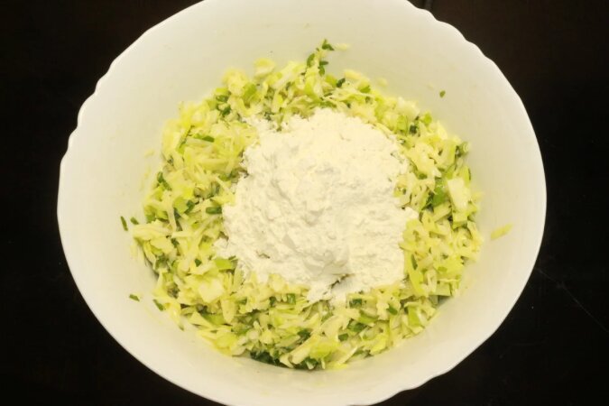 Ziemniaki ścieram na grubej tarce, kapustę drobno siekam, w tym przypadku użyłam młodej, jeśli biorę twardą kapustę, to zalewam ją wrzątkiem na kilka minut. Posiekaną kapustę wkładam do miski z ziemniakami, dodaję jajka, zioła do smaku (mam zieloną cebulkę i pietruszkę), śmietanę lub kefir, sól i pieprz.