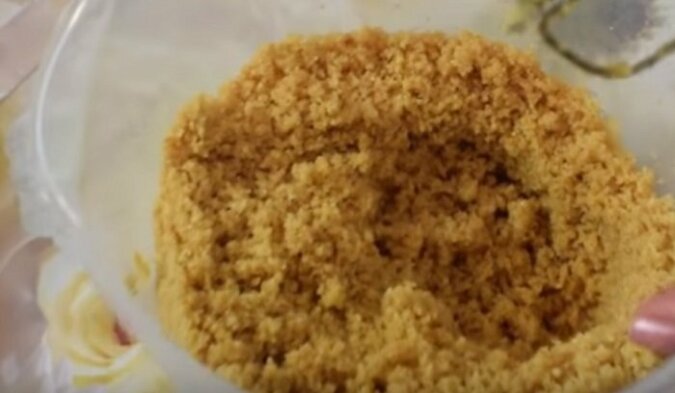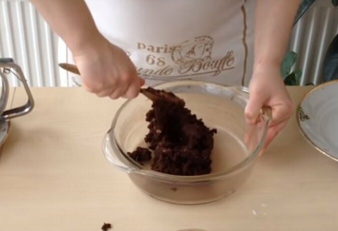 W wygodnym pojemniku połącz okruchy herbatników z kakao i cukrem pudrem, zmiękczonym masłem i orzechami. Dobrze wymieszaj, aby połączyć masło z całą mieszanką.