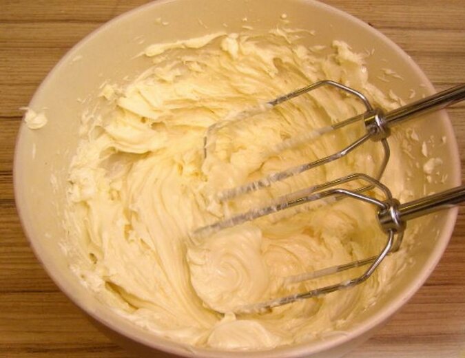 1. Umieść masło o temperaturze pokojowej w wysokiej misce i ubij mikserem.