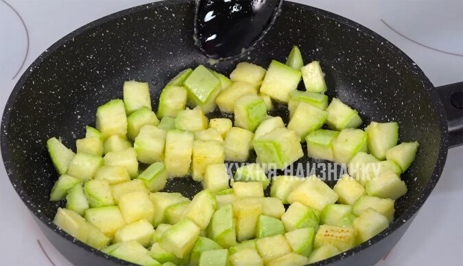 Cukinię smażę w niewielkiej ilości oleju roślinnego (najpierw strząsam nadmiar mąki). Ciągle mieszam, smażę do miękkości.