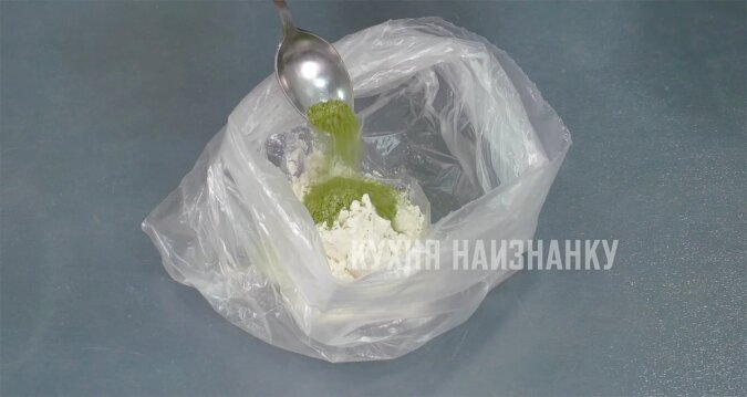 Do torebki wrzucam kilka łyżek mąki i przypraw z solą. Używam mojej zielonej soli. Ale możesz też wziąć dowolne ulubione przyprawy.