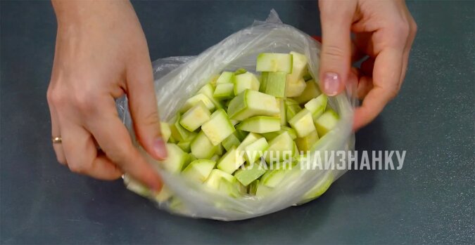 Teraz tutaj, do torebki, wkładam pokrojoną cukinię. I dobrze potrząsam foliówką, aby mąka z przyprawami równomiernie przykryła kawałki cukinii.