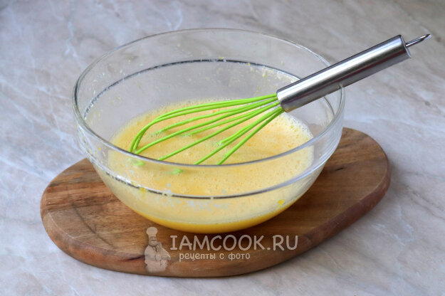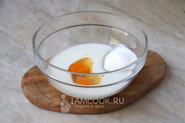 W odpowiedniej misce połącz kefir o temperaturze pokojowej (mam 2,5% zawartości tłuszczu, ale możesz użyć dowolnego), cukier granulowany i jaja kurze.
