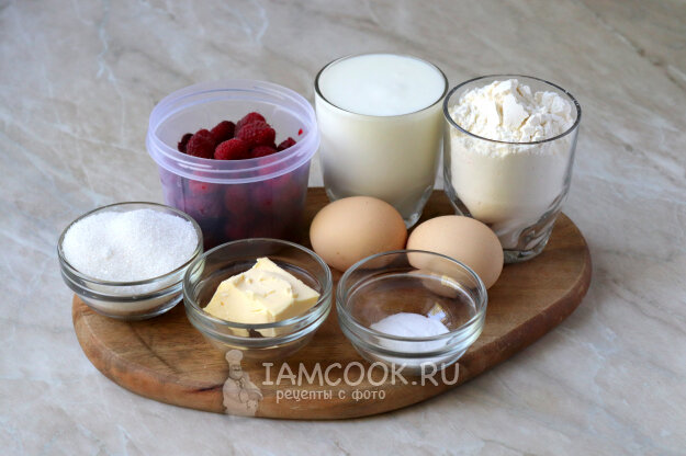Aby zrobić ciasto malinowe na kefirze, przygotuj produkty według listy. Rozpuść masło w kuchence mikrofalowej i pozwól mu ostygnąć. Przesiej mąkę pszenną z sodą oczyszczoną przez drobne sito.
