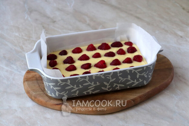 Naczynie żaroodporne przykryj pergaminem i wlej połowę ciasta. Równomiernie rozprowadź na nim maliny.