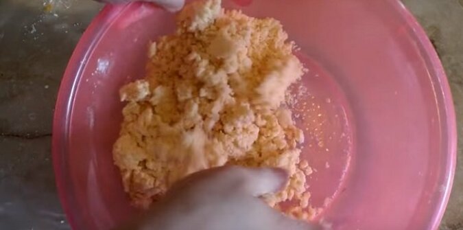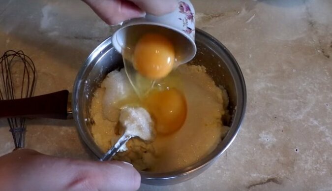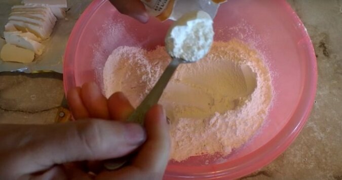 1. Aby przygotować ciasto, przesiej mąkę do głębokiej miski. Dodaj proszek do pieczenia, wymieszaj, a następnie dodaj schłodzone masło (można zastąpić margaryną).